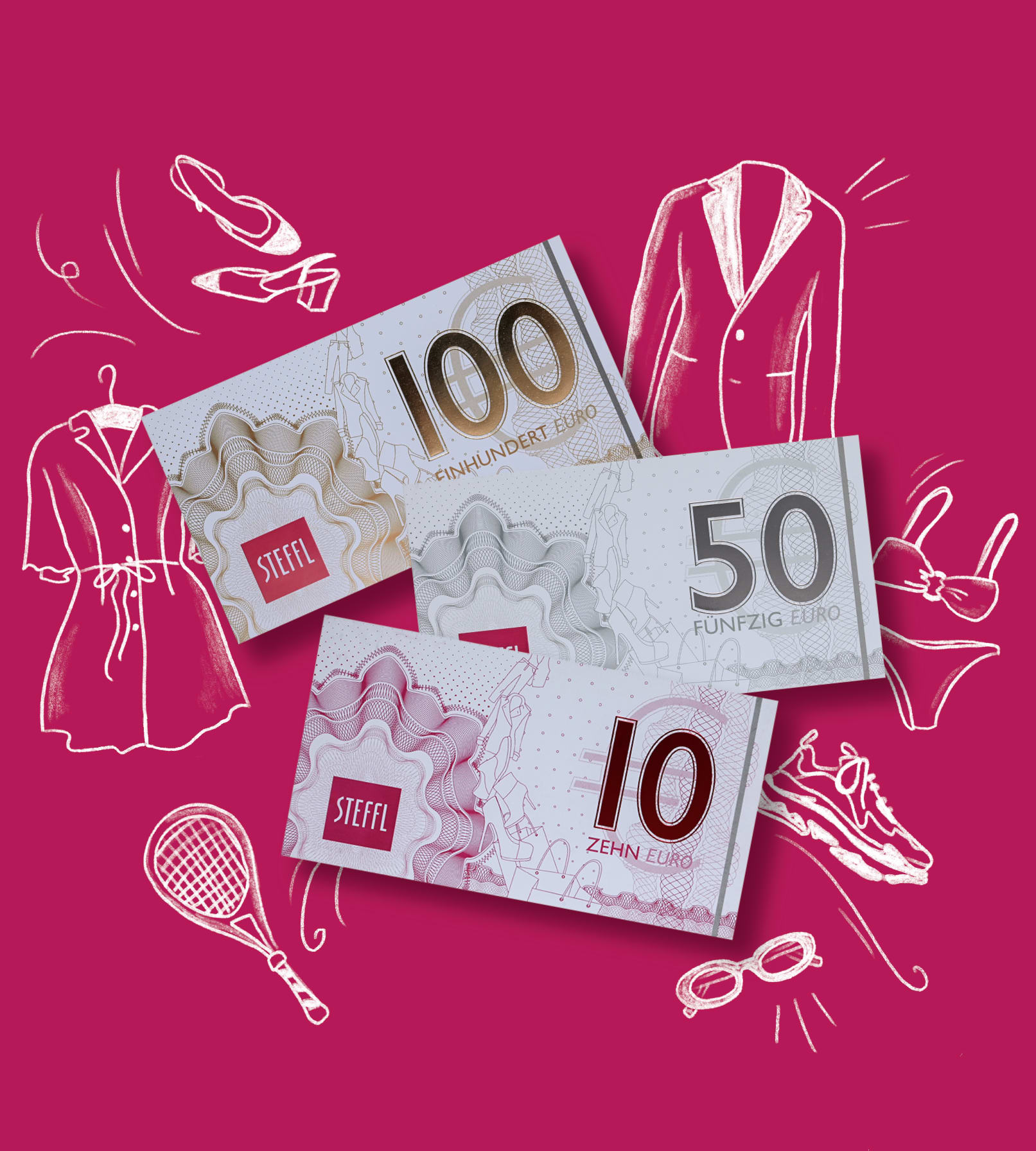 Mit STEFFL Gutscheinen schenken Sie Ihren Liebsten die freie Auswahl aus über 70.000 Premium Produkten von 500 Marken. Unsere Gutscheine können im gesamten STEFFL, sowie in unserer Sky Gastronomie eingelöst werden.